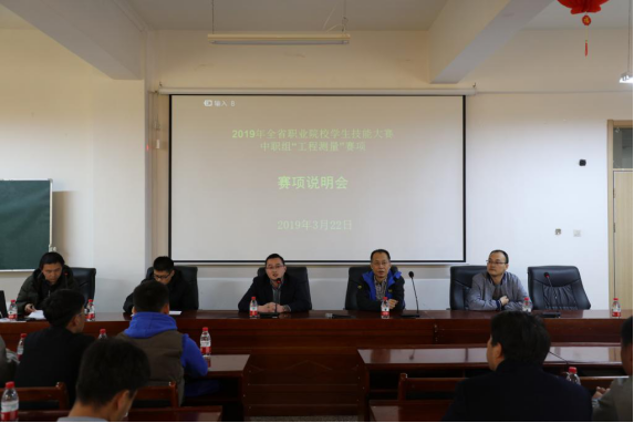 3月22日下午,由甘肃省教育厅主办,甘肃建筑职业技术学院承办的2019年甘肃省职业院校学生技能大赛中职组“工程测量”赛项说明会在学院康乐校区报告厅举行。大赛“工程测量”赛项主任评委马铭,赛项评委司大刚,学院教务处副处长席攀峰,学院测绘地理信息系副书记、副主任刘宗波和来自全省的14所中职院校的14支代表队、42名参赛选手和指导教师参加康乐校区赛项说明会。