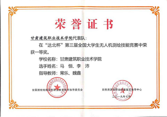7月15日—18日,由全国测绘地理信息职业教育教学委员会、自然资源部职业技能鉴定指导中心主办,北京达北科技有限公司协办的“达北杯”第三届全国大学生无人机测绘技能竞赛在山东水利职业学院举行,来自全国23个省、直辖市、自治区和解放军院校的78支队伍同台竞技。经过激烈的角逐,学院测绘地理信息系马恒、李沛两位同学组成的代表队在指导教师常乐、魏鑫的精心指导下,凭借优秀的团队协作能力、出色的专业操作技能斩获团体一等奖。