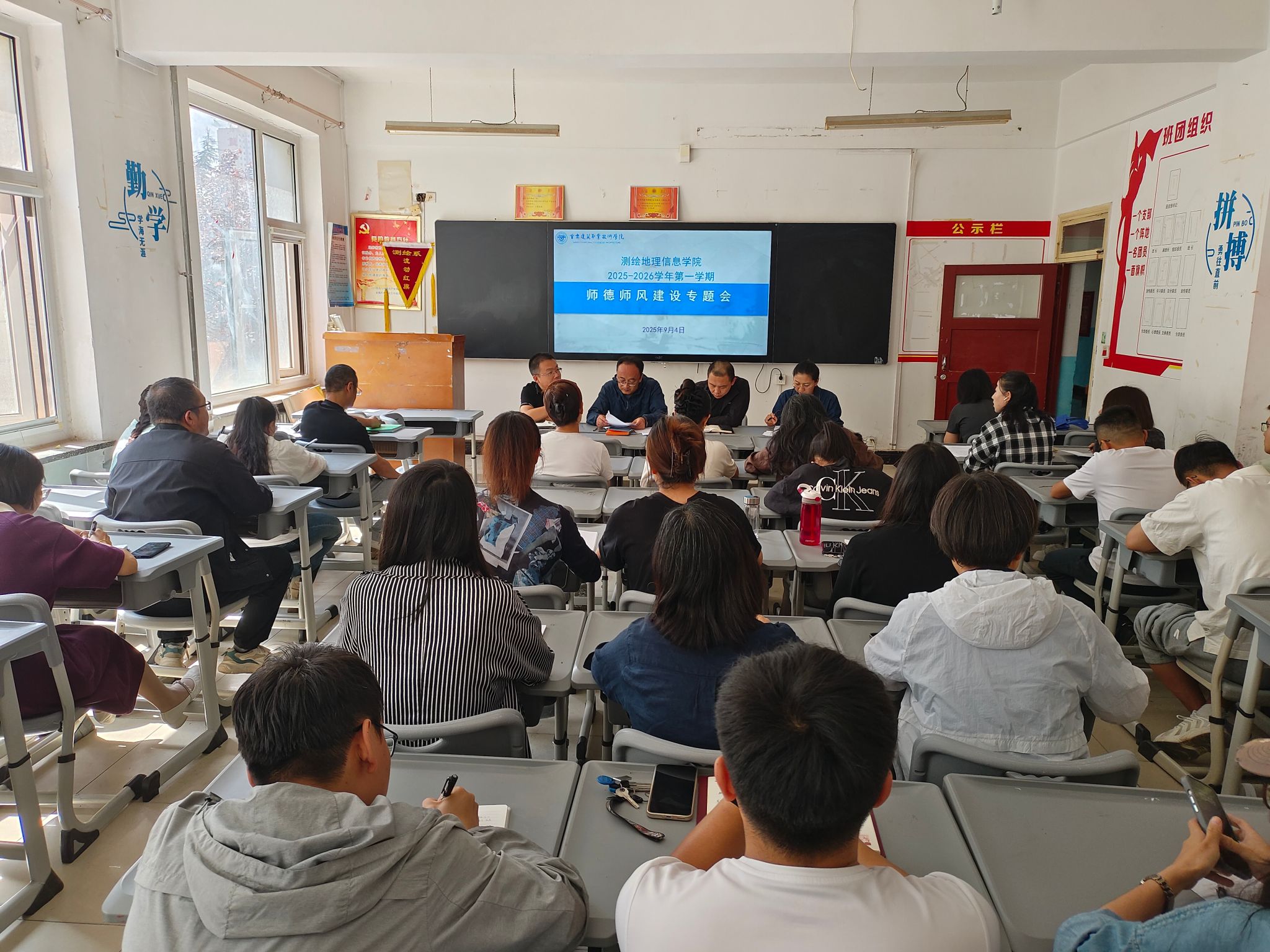 测绘地理信息学院于9月4日中午13:40在2#楼2-7教室召开2025-2026学年第一学期开学工作会议暨师德师风专题会议,全体教师参会。副院长李海英主持会议。