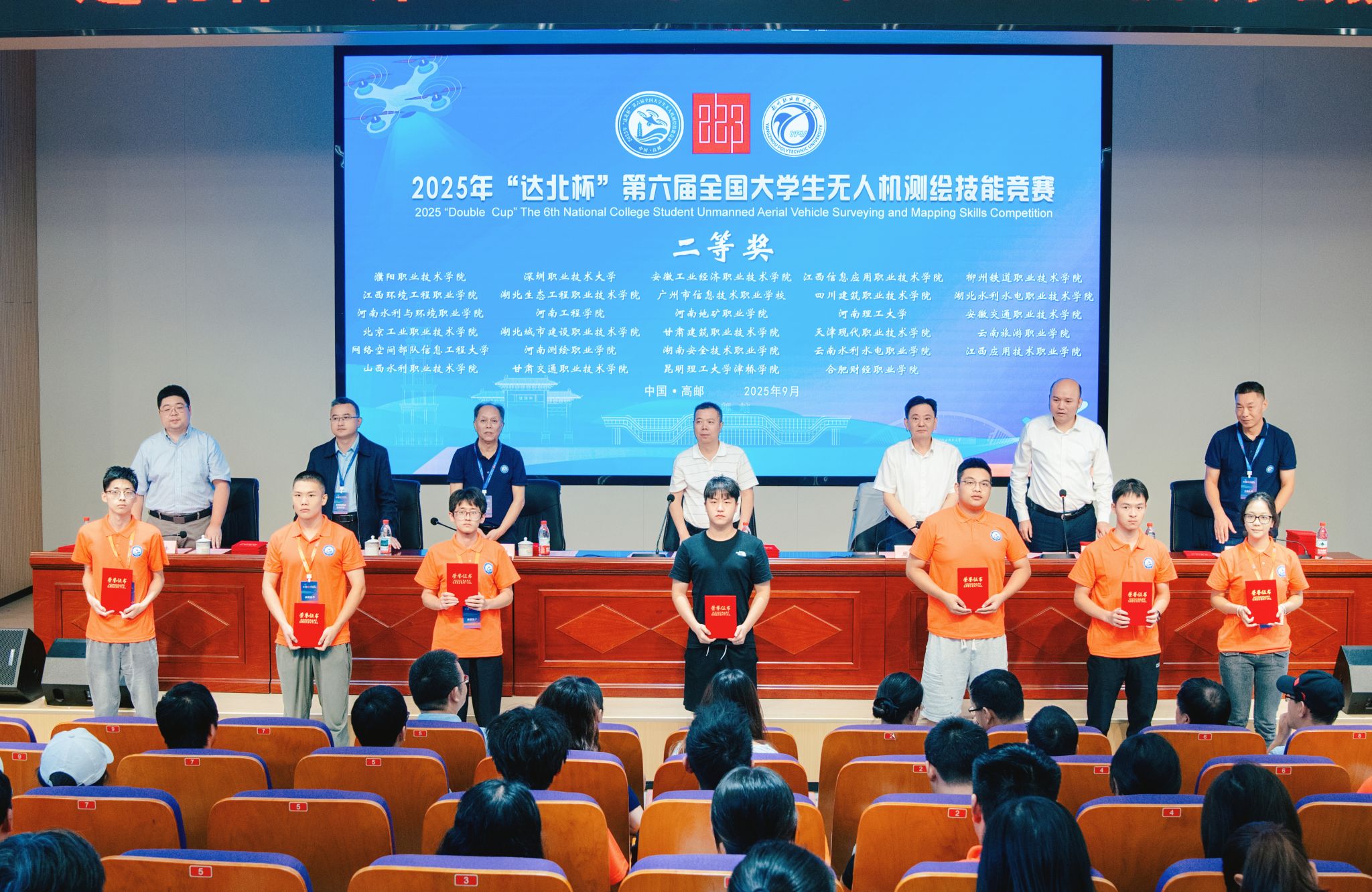 2025年9月22日,“达北杯”第六届全国大学生无人机测绘技能竞赛在江苏省高邮市扬州职业技术大学圆满落幕。由2023级空间数字建模与应用技术1班的邓天磊、孟世锦两位同学组成的参赛队,在陈永胜、刘红兵两位教师的指导下,凭借出色的表现,在全国73所本科、职业院校同台竞技的激烈角逐中脱颖而出,荣获竞赛二等奖。