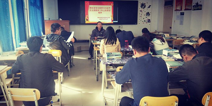 为了进一步响应习近平总书记在全国教育工作大会上的讲话精神,严格把习近平总书记的讲话精神落实到教育教学的全过程,实现全员育人的良好环境。根据我系党支部学习计划,我系党支部组织全体党员教师于10月11日在校本部二号教学楼2-11教室学习了习近平总书记在全国教育工作大会上的讲话,学习了《深入学习贯彻习近平总书记关于教育的重要论述奋力开创新时代教育工作新局面》的文章,学习大会由刘攀老师主持。