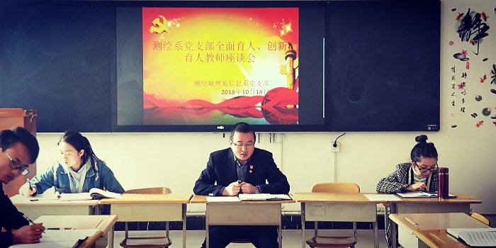 为全面贯彻党的教育方针、培养德智体美全面发展的社会主义建设者和接班人,发展素质教育,加快构建以社会主义核心价值观为引领的德育体系,注重培养学生适应时代要求、支撑终身发展的关键能力,建立促进学生身心健康、全面发展的长效机制,形成学校教育、家庭教育、社会教育有机结合的全社会共同育人格局,造就担当民族复兴大任的时代新人,测绘地理信息系党支部组织全体教师开展“全面育人、创新育人”为主题的座谈会,在教师中间开展调研。测绘地理信息系党支部书记、系主任刘宗波主持座谈会,测绘系全体教师参加了座谈会。