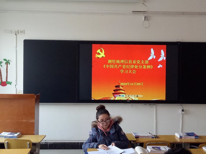 为进一步教育广大师生党员,严格遵守党的纪律,同时也为全面学习领会《条例》修订的重大意义、主要内容和精神实质,测绘地理信息系党支部于11月29日在2号楼2-4教室召开《中国共产党纪律处分条例》学习大会,大会由党支部组织委员王倩同志主持。