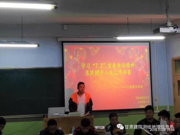 作为新一代青年,要明白年轻人肩负的责任,,同时要带领同学们不断积极进取,不断学习提高自己的能力。10月8日,甘肃建院测绘地理信息系团总支组织测绘系学子学习总书记7·2重要讲话精神,传达学习7月2日习近平总书记在同团中央新一届领导班子成员集体谈话时的重要讲话精神,部署学习宣传贯彻落实举措。