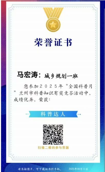 在2025年全国科普月活动中,由兰州市科学技术协会主办的科普知识竞赛火热开展,吸引学院24、25级1000余名师生踊跃参与,以知识竞答的形式开启科学探索之旅,在校园中掀起了一股“爱科学、学科学、用科学”的热潮。