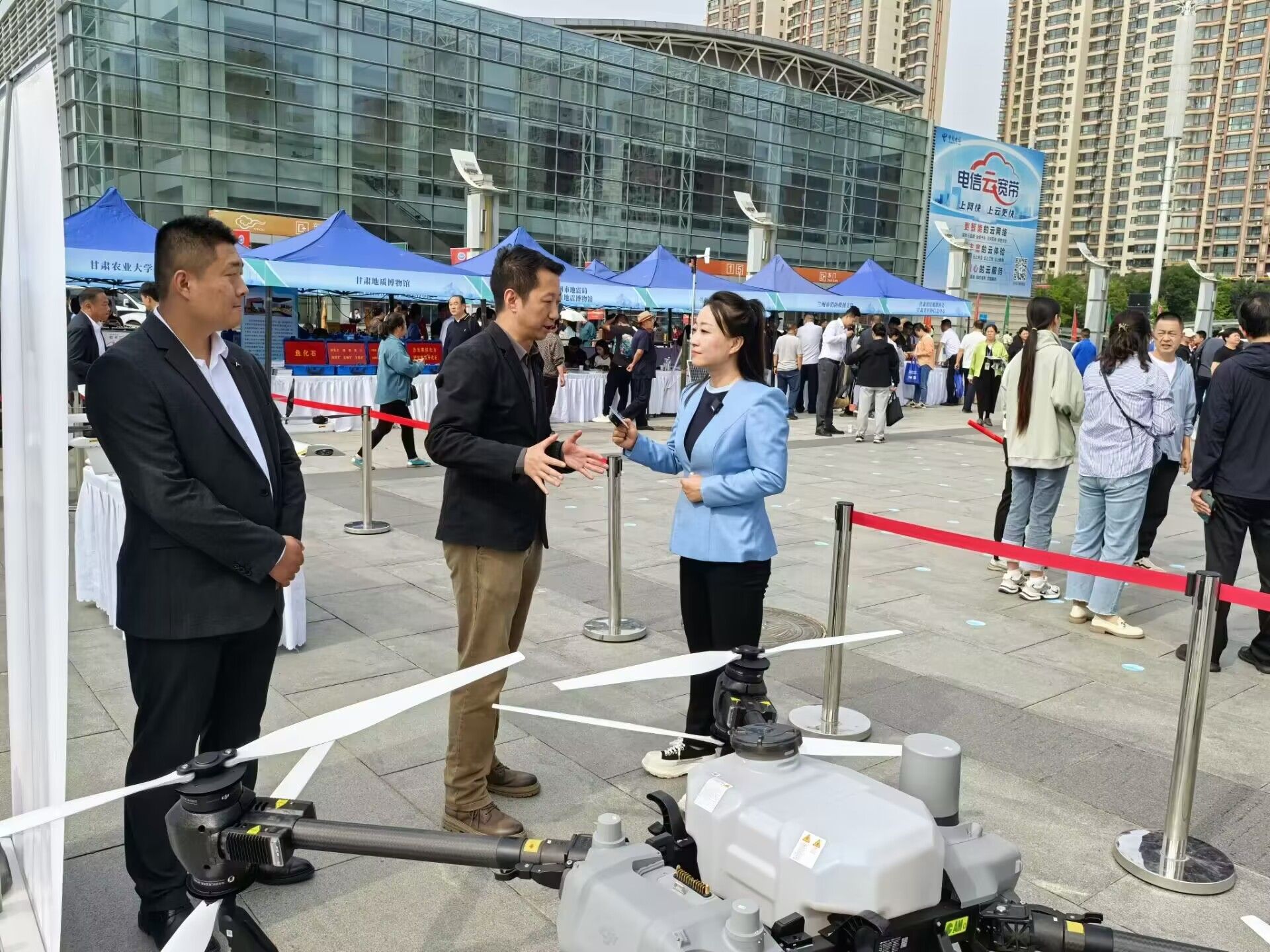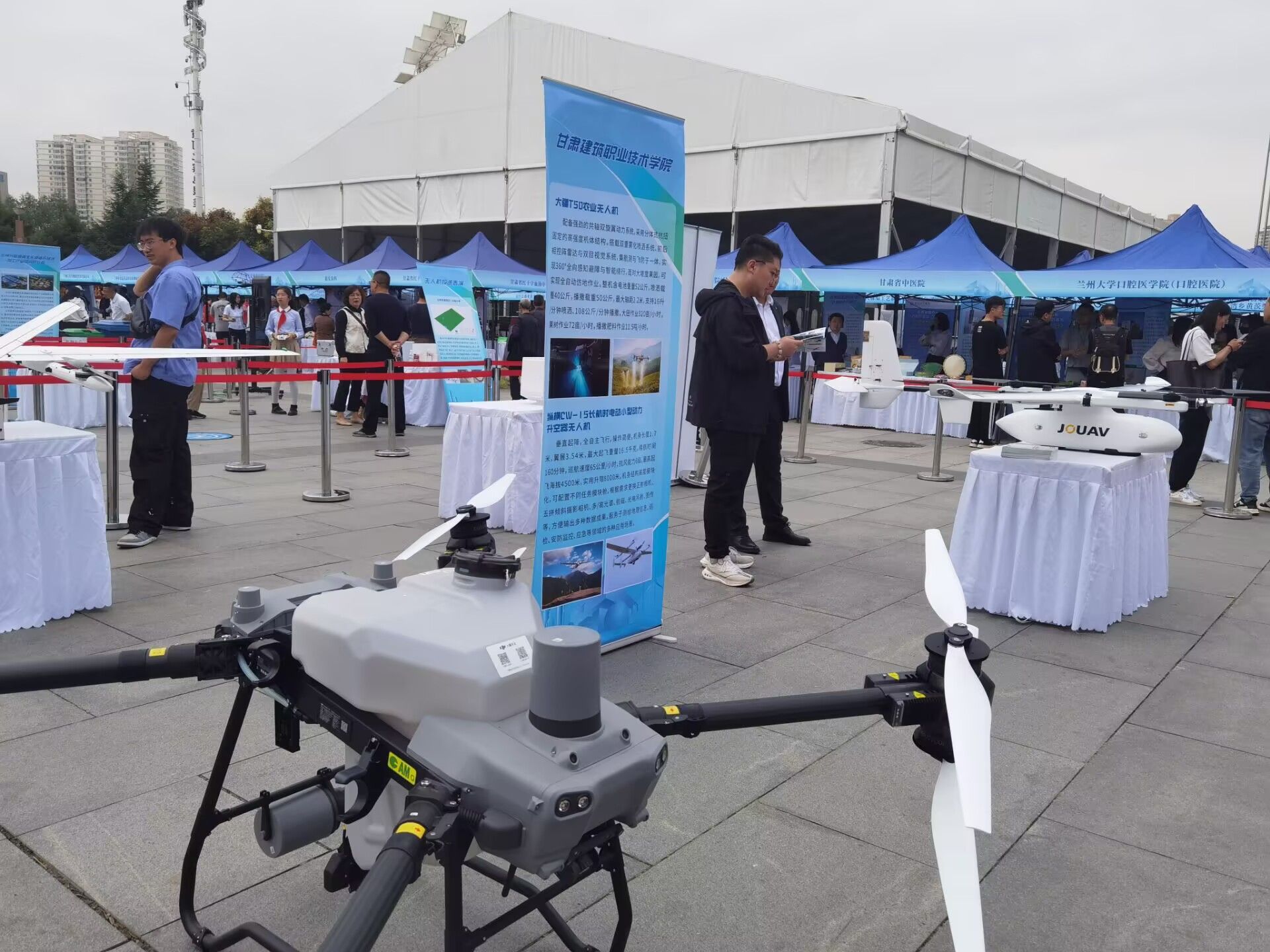 我院教师常乐、张森以及优秀毕业生刘昱祖携带纵横CW-15动力升空器无人机和大疆DJI T50农业无人机,与甘肃大禹九州空间信息科技有限公司、甘肃长风电子科技有限责任公司专家一起组成校企合作科普团队,在无人机体验区进行了现场静态展示和设备讲解工作。